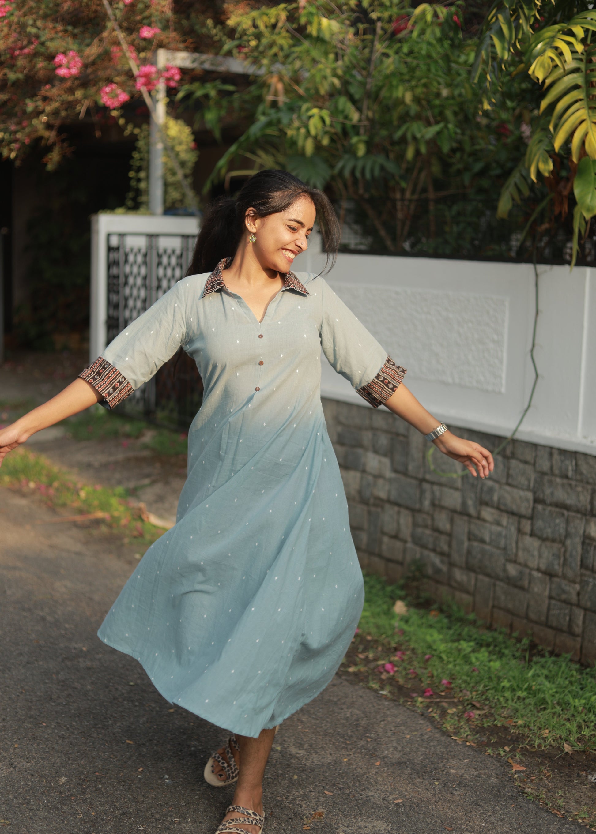 Simple, Soft cotton light bluish tone dress with contrast Ajrak patched colar and sleeves.